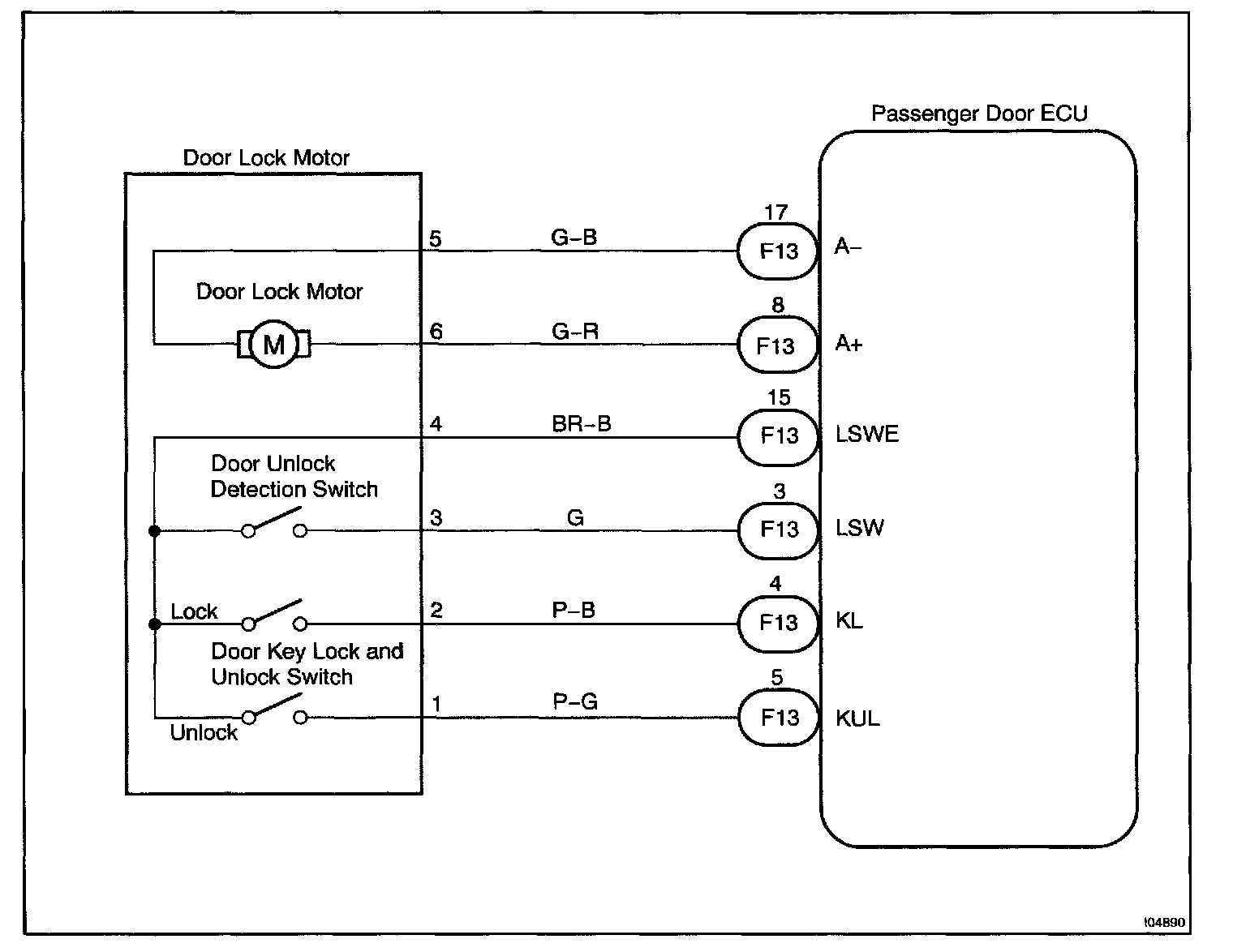 The door key lock and unlock switch is built in the door key cylinder. When the key is turned to the lock side, terminal 3 of the switch is grounded and when the key is turned to the unlock side, terminal 2 of the switch is grounded.