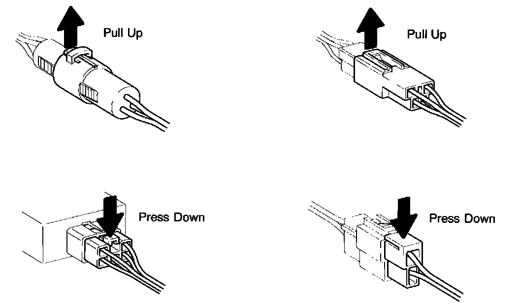 Disconnection of Male and Female ConnectorsTo pull apart the connectors, pull on the connector itself, not the wire harness.