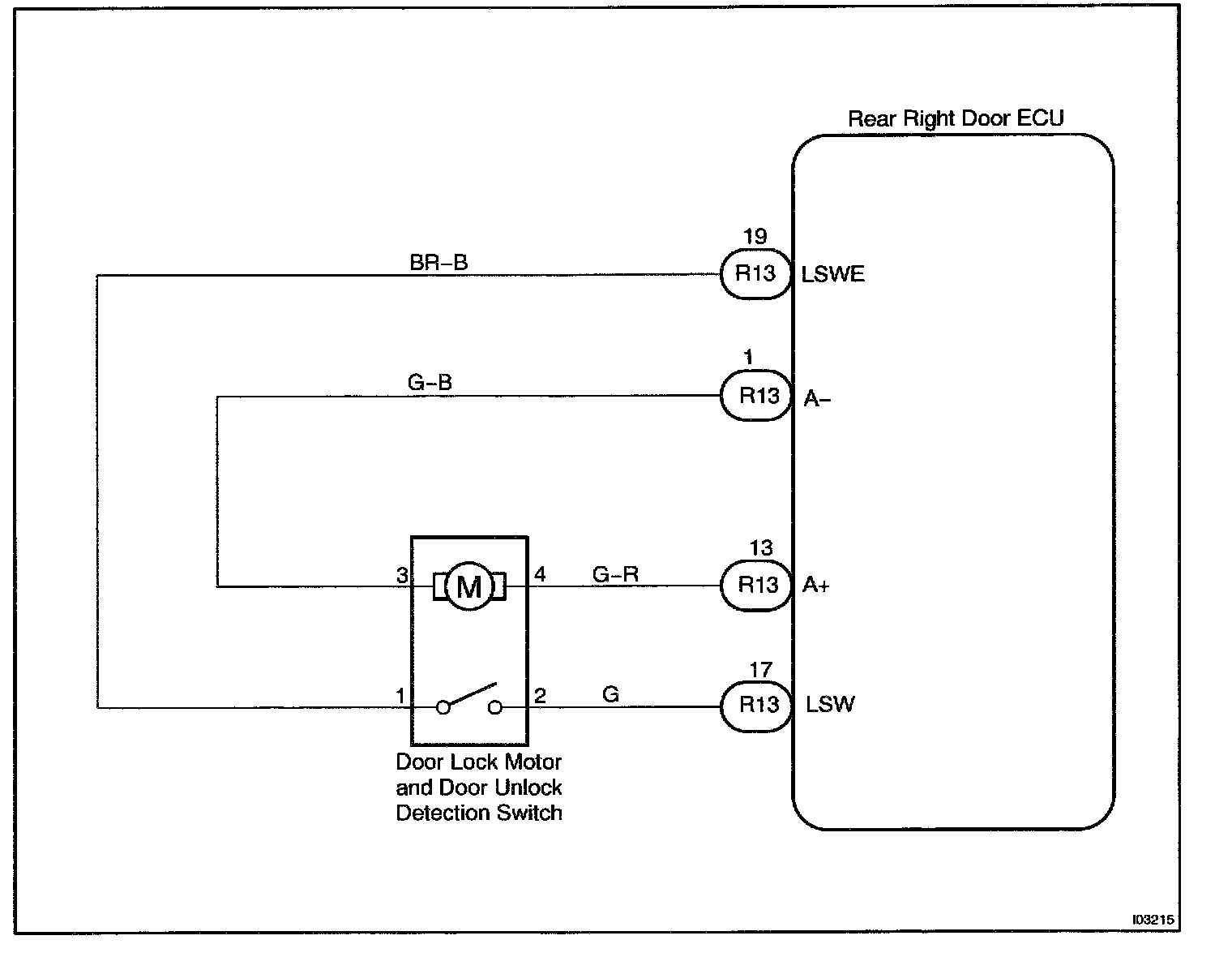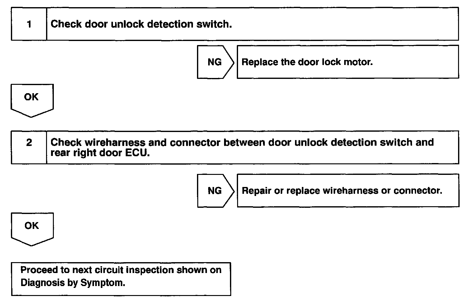 The door unlock detection switch is built in the door lock motor assembly. This switch is ON when the door lock knob is in the unlock position and OFF when the lock knob is in the lock position. The ECU detects the door lock knob conditions is this circuit. It is used as one of the operating conditions for the key confinement prevention function.