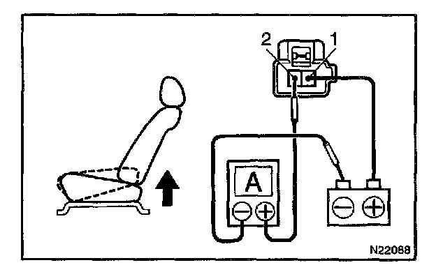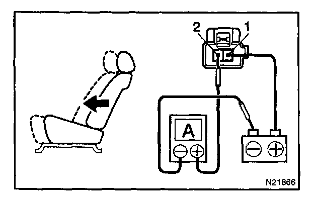 a. Connect the positive (+) lead from the battery to terminal 2, the positive (+) lead from the ammeter to terminal 1 and the negative (-) lead to the battery negative (-) terminal, then recline the seat back to the most forward position.