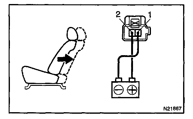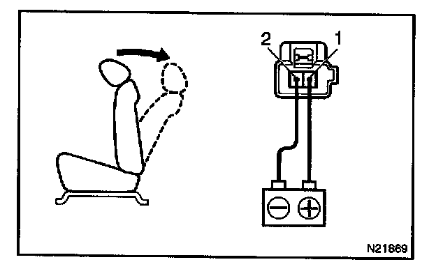 a. Connect the positive (+) lead from the battery to terminal 1 and the negative (-) lead to terminal 2, check that the lumbar support moves to release side.