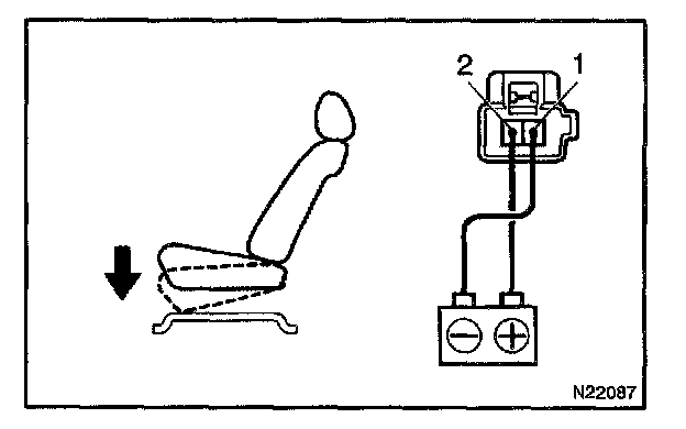d. Approximately 60 seconds later, connect the positive (+) lead from the battery to terminal 1(2) and the negative (-) lead to terminal 2 (1), check that the seat cushion begins to descend.