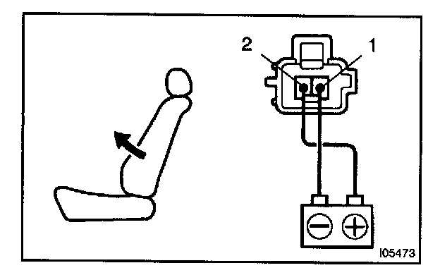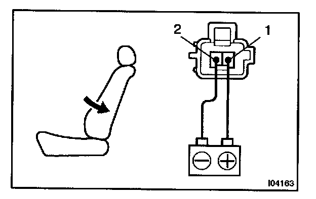 d. Approximately 60 seconds later, connect the positive (+) lead from the battery to terminal 2 (1) and the negative (-) lead to terminal 1(2), check that the seat cushion begins to move backwards.