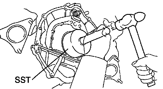 4. Using SST and a hammer, tap in the oil seal until its surface is flush with the rear oil seal retainer edge.