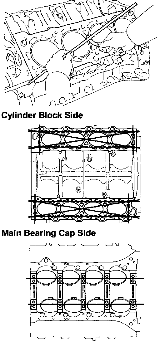Using a precision straight edge and feeler gauge, measure the surfaces contacting the cylinder head and main bearing cap for warpage.
