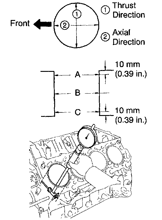 Using a cylinder gauge, measure the cylinder bore diameter at positions A, B and C in the thrust and axial directions.