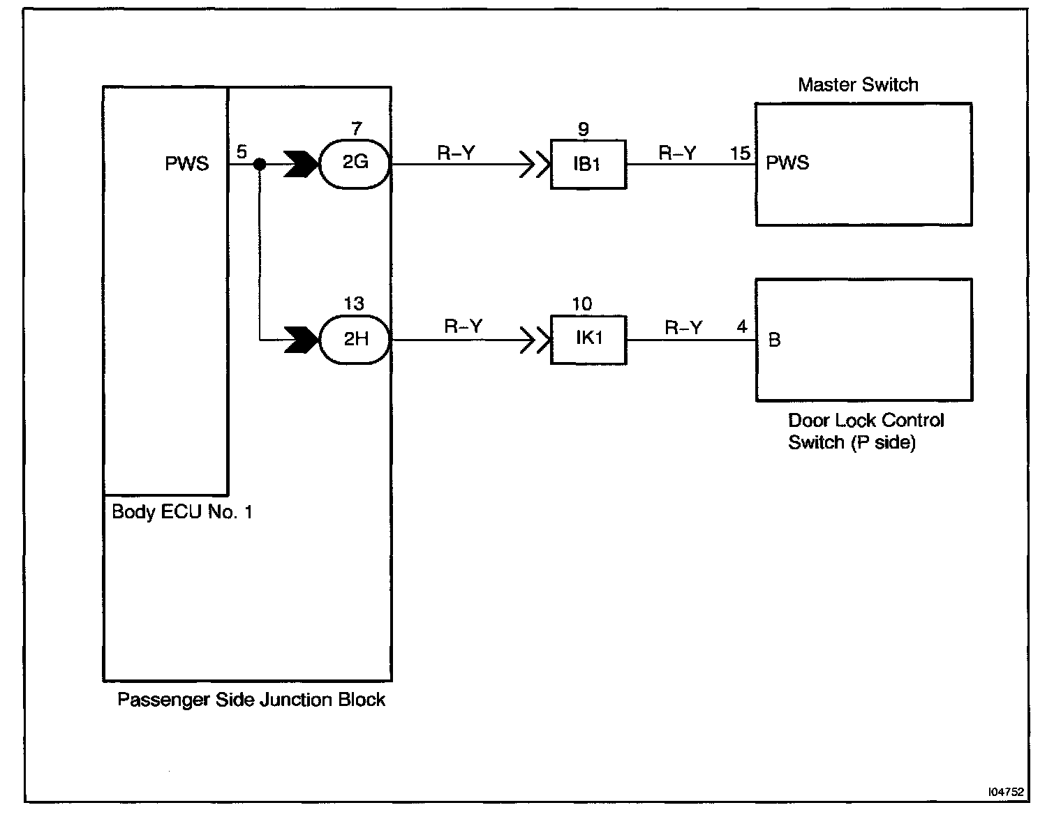 This circuit is the power source of the master switch for the driver's door and the door lock switch for the passenger's doors.