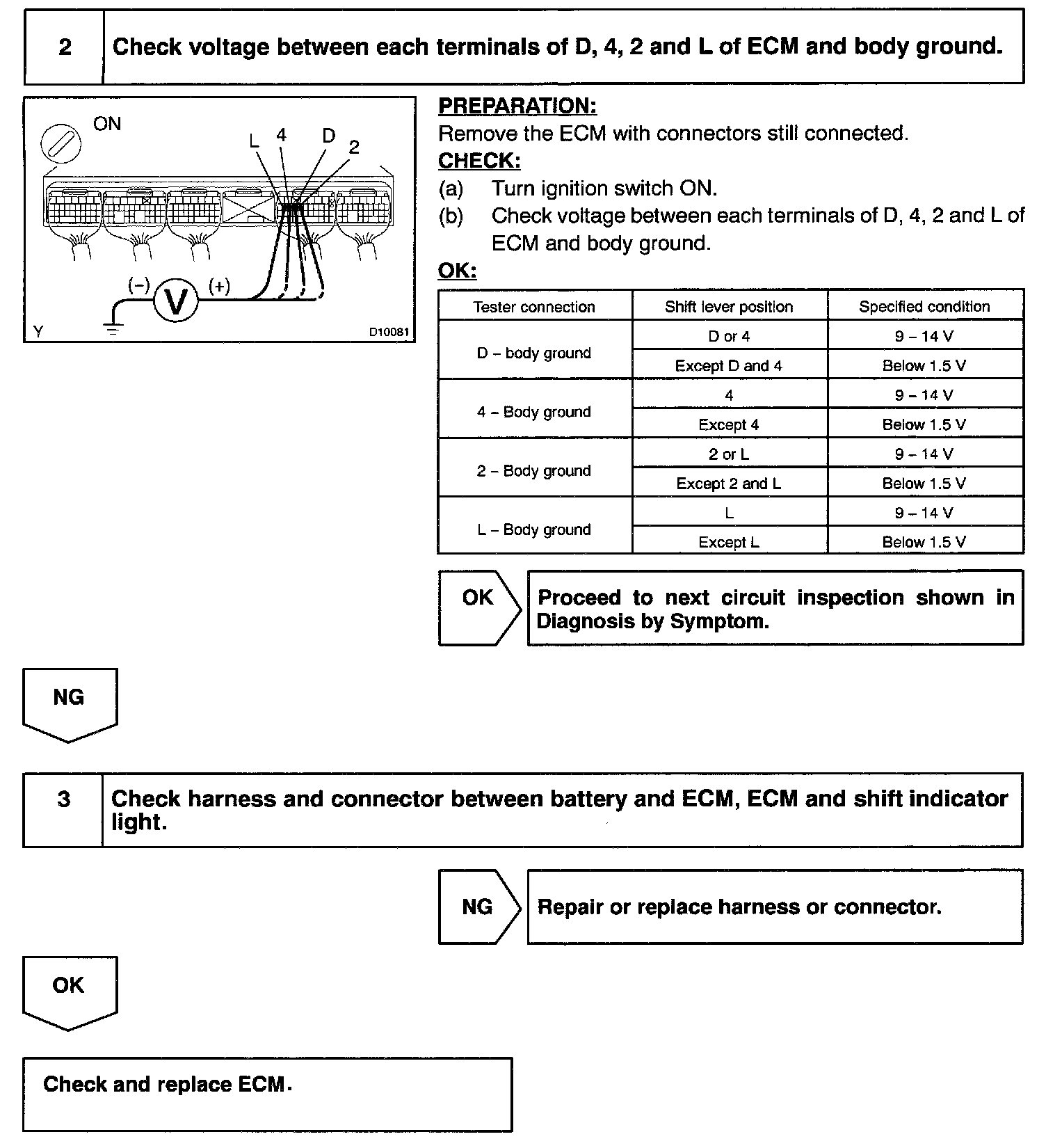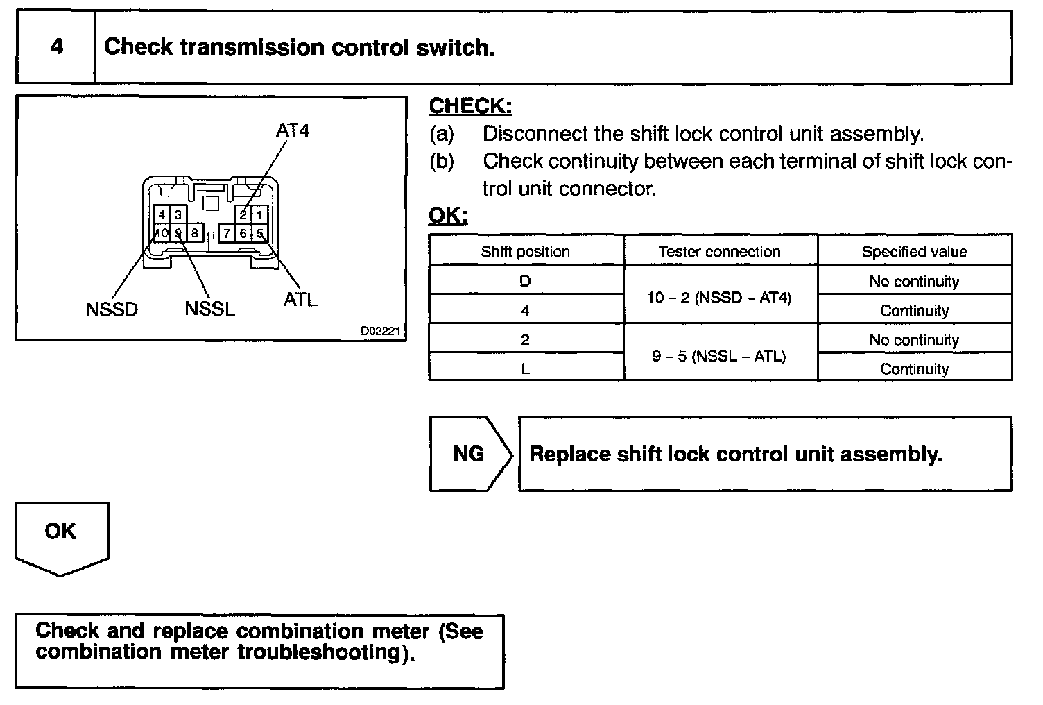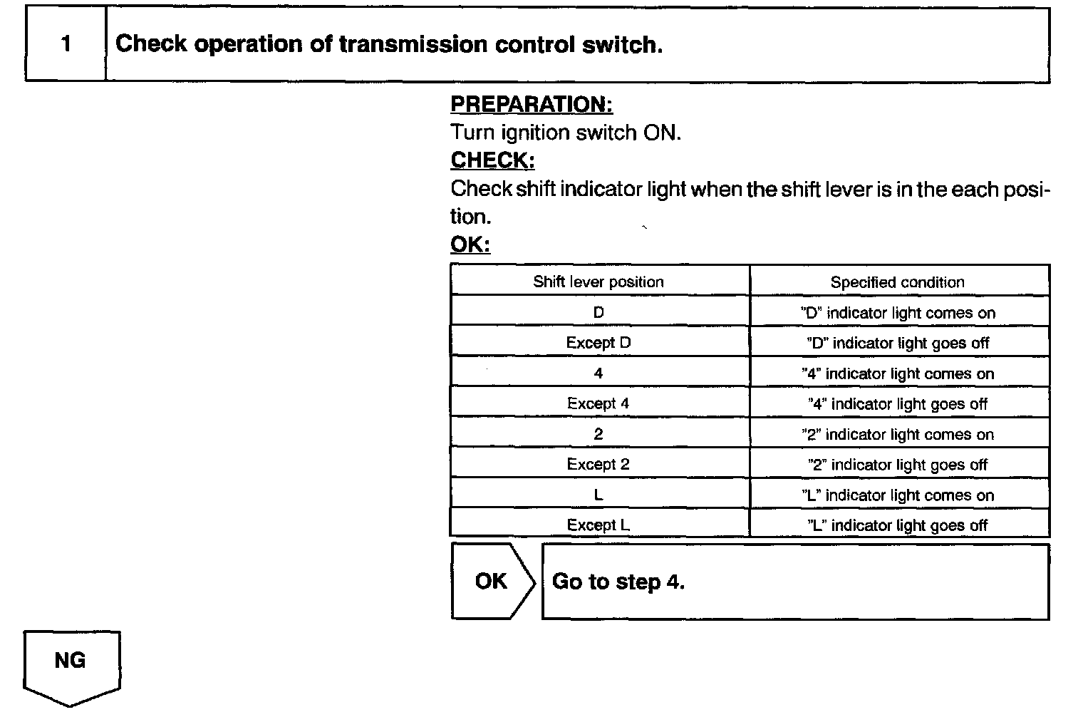 When the shift lever is in the 4 position (with transmission control switch for D and 4 pressed), "4" in the shift position indicator light will come on and when the shift lever is in the D position (with transmission control switch for D and 4 released), "D" in the shift position indicator light will come on.