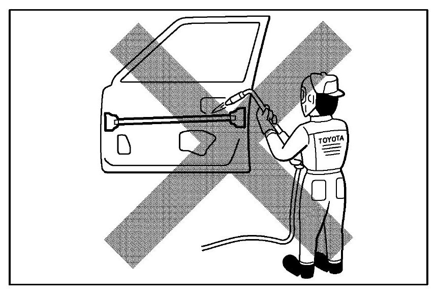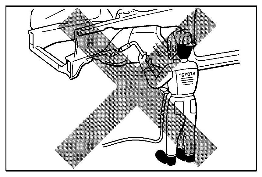 If a body structure parts are heat repaired with an acetylene torch or other heating source, the crystalline organization of the steel sheet will change and the strength of the steel sheet will be reduced. The ability of the body to resist rust is significantly lowered as well since the rust resistant zinc coating is destroyed by heat and the steel sheet surface is oxidized.