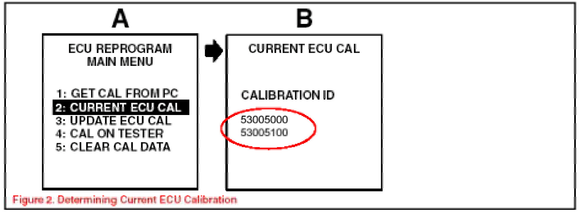 2. Connect the Diagnostic Tester to the vehicle and select CURRENT ECU CAL from the ECU REPROGRAM MAIN MENU. Determine the vehicle's current ECU calibration. (See Figure 2)