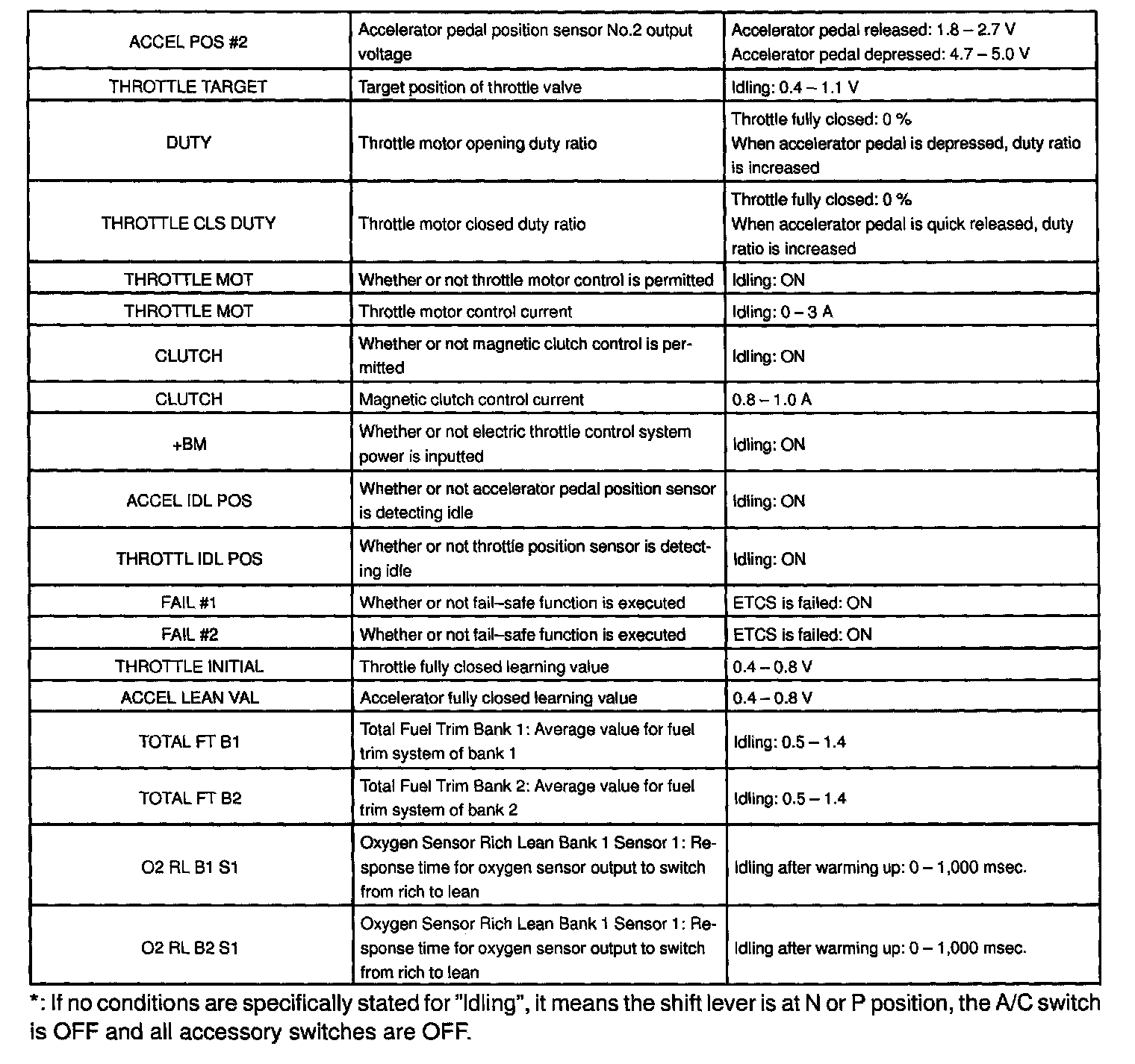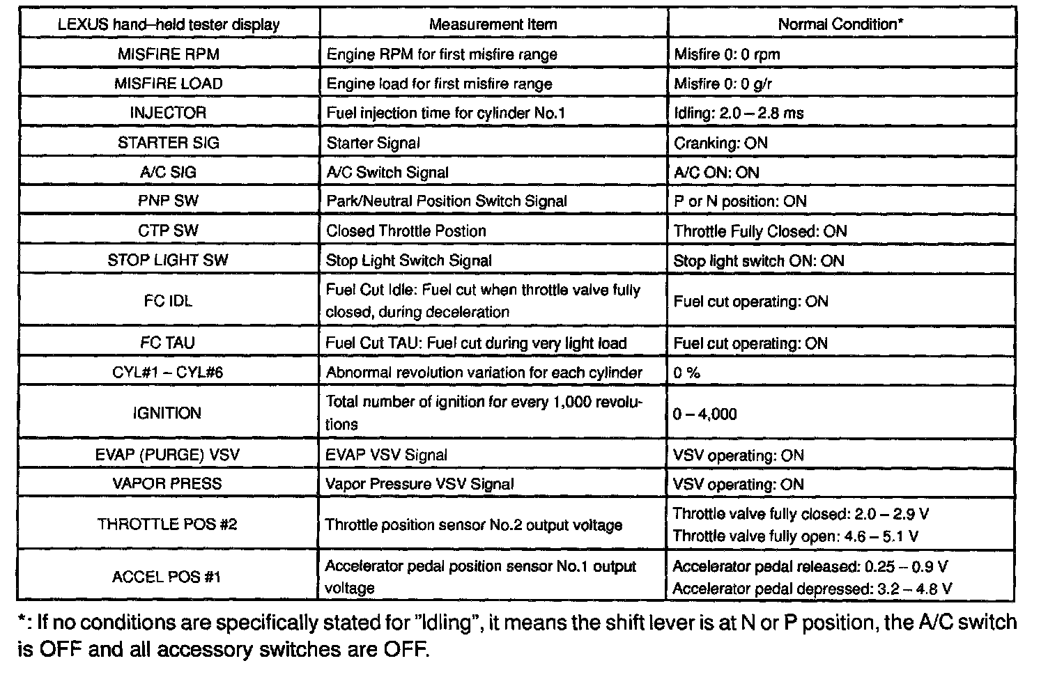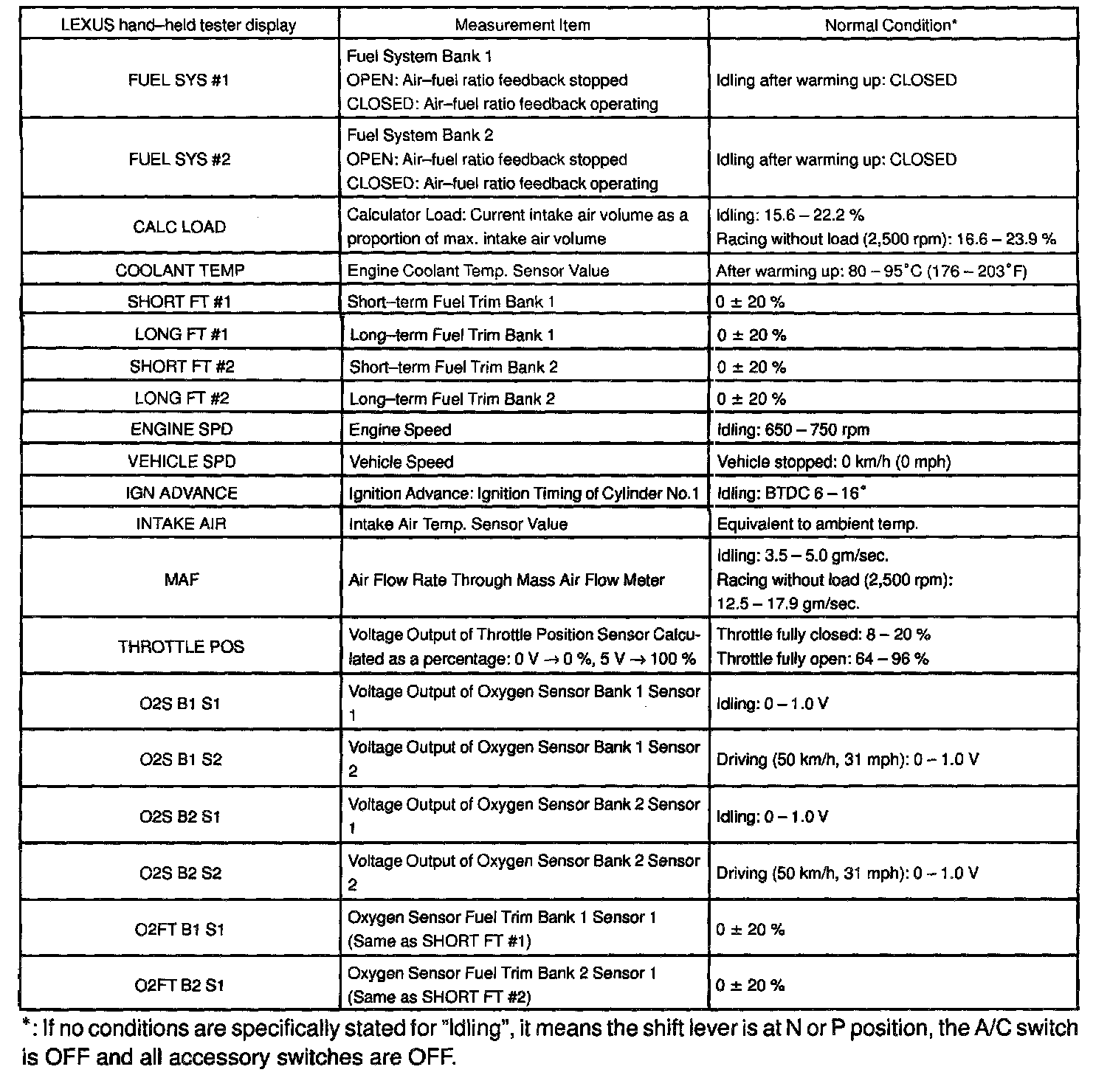 ENGINE OPERATING CONDITIONNOTE: The values given for "Normal Condition" are representative values, so a vehicle may still be normal even if its value varies differ from those listed here. So do not decide whether a part is faulty or not solely according to the "Normal Condition" here.