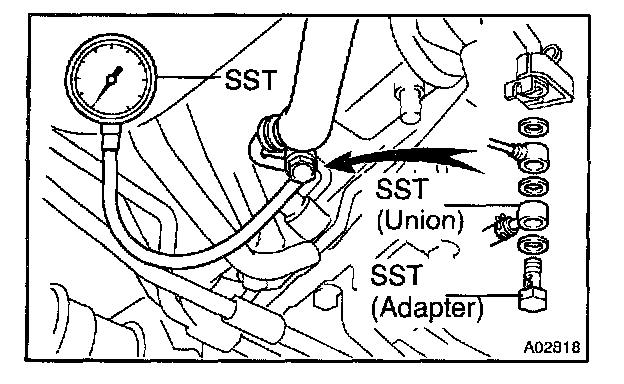 d. Install the fuel inlet hose and SST (pressure gauge) to the fuel pipe support with the 3 gaskets and SST (union and adapter).