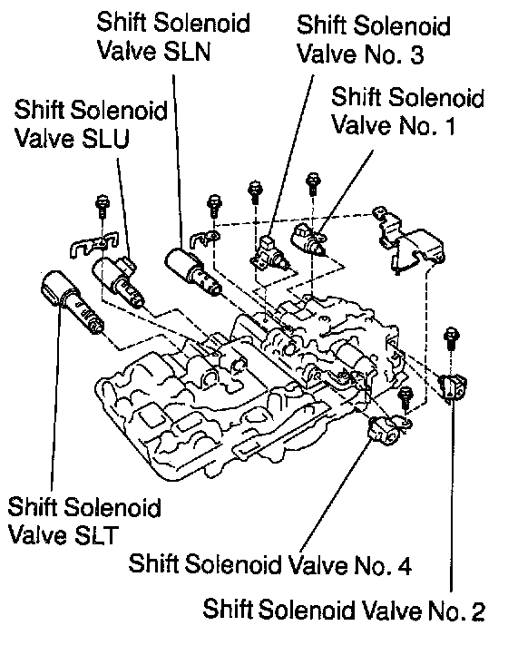 Install the shift solenoid valve No. 1, No. 2 and No. 3 with the 3 bolts.