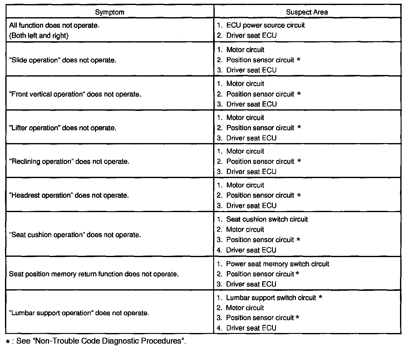Problem Symptoms Table - Power Seat Control System (Front Passenger's Seat):