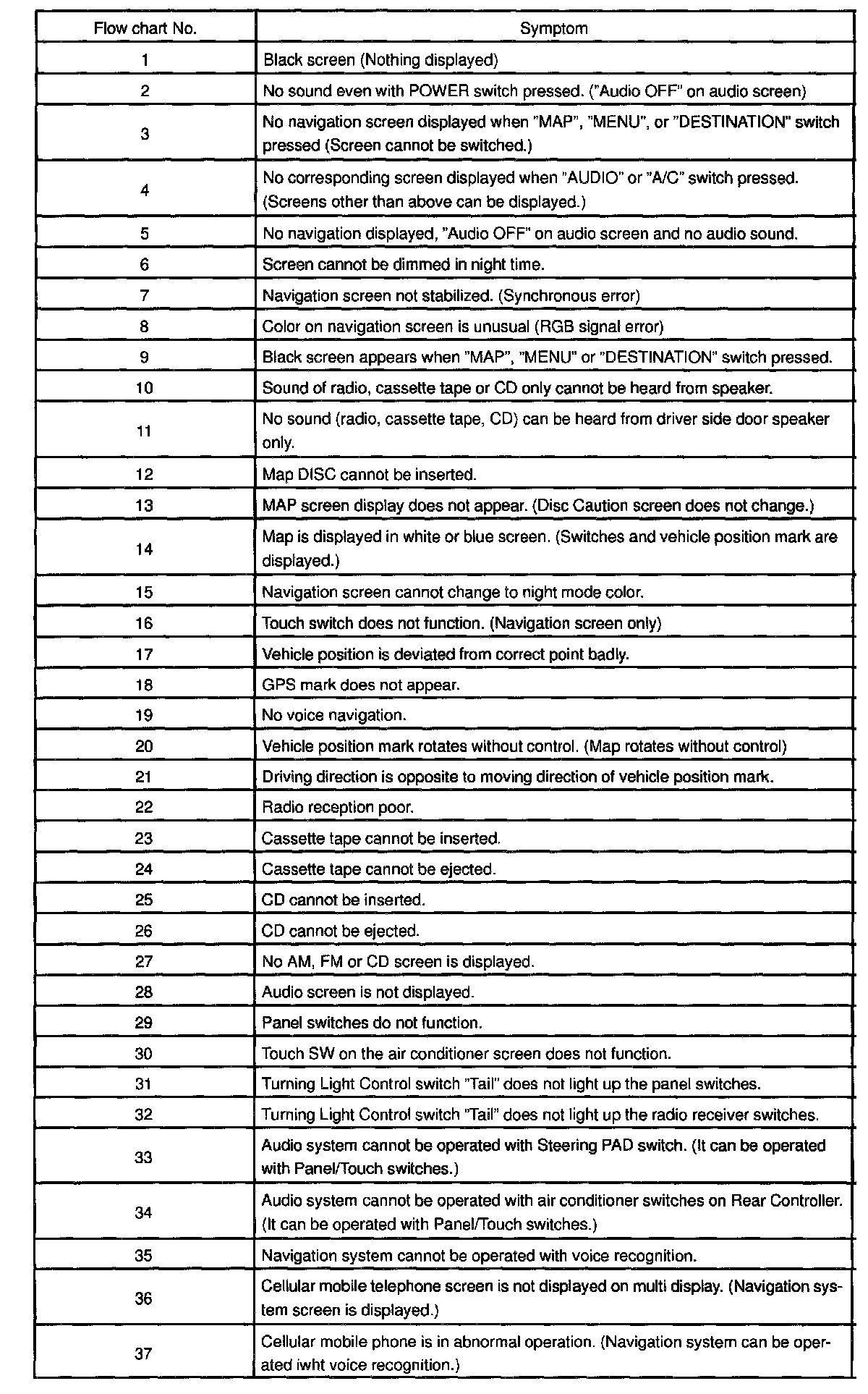 Problem Symptoms Table