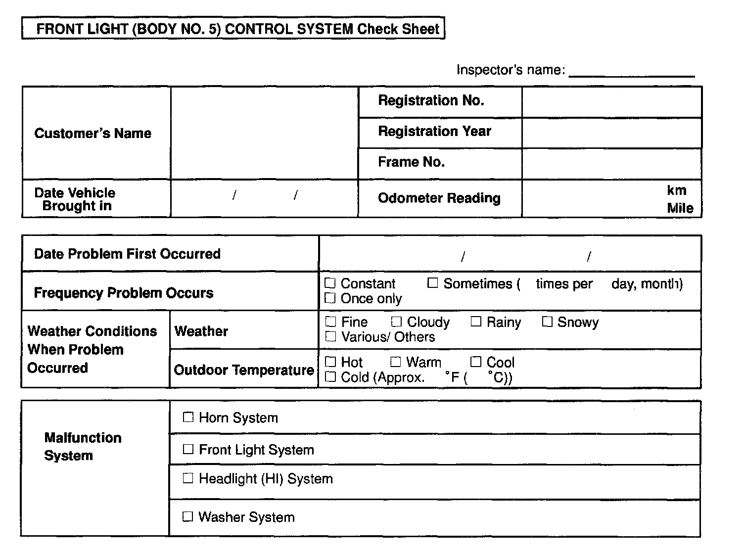 Front Light (Body NO.5) Control System Check Sheet:
