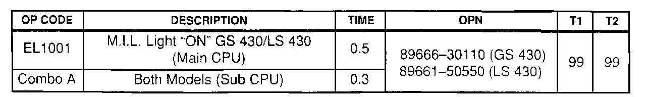 After starting the engine under certain cold operation conditions, some 2001 model year GS 430 and LS 430 vehicles may exhibit M.I.L. "ON" with DTC numbers P0300 through P0308 (random misfire and single cylinder misfire). The Engine Control Module (ECM) calibration files were revised to correct this condition.