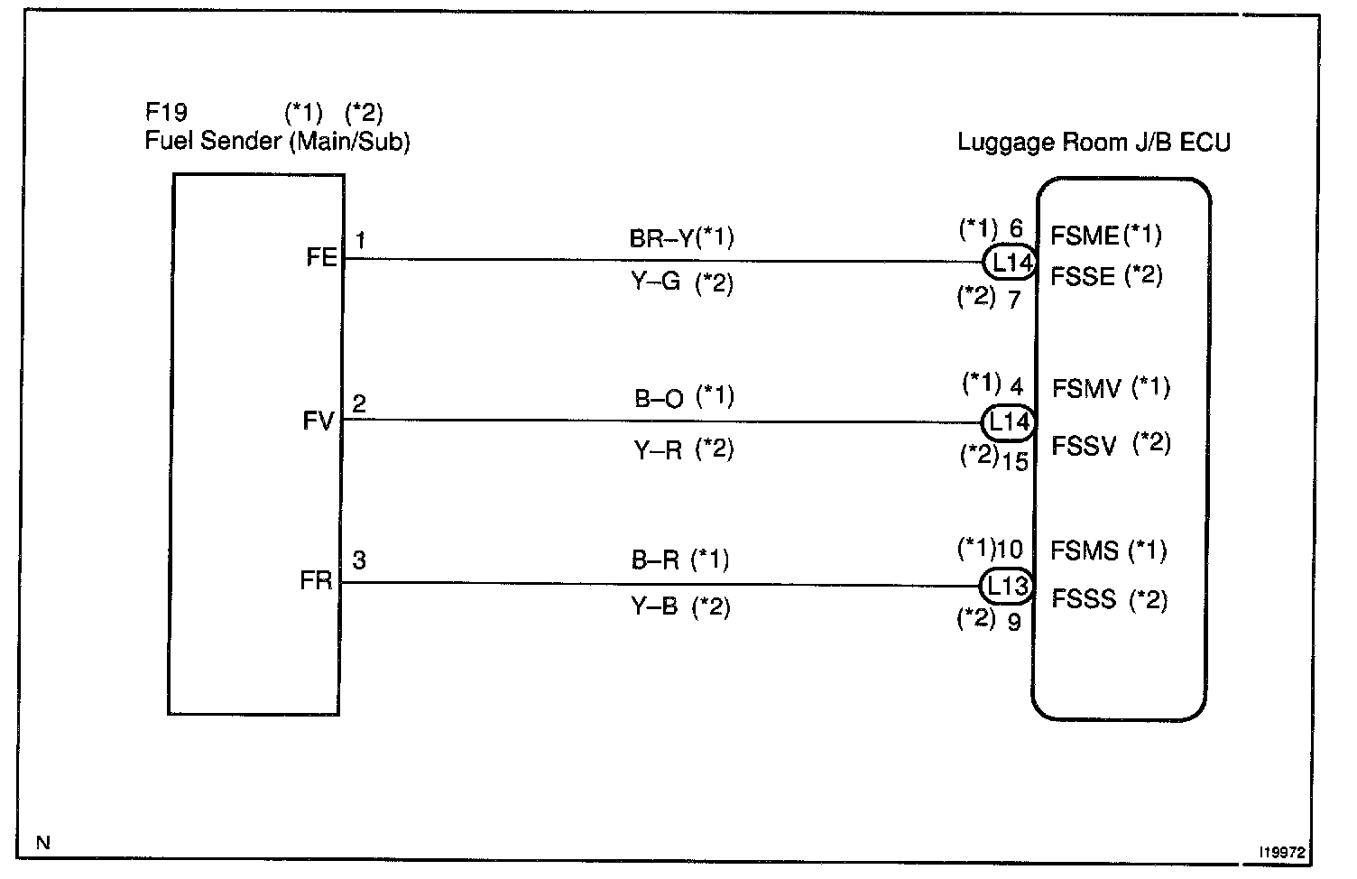 CIRCUIT DESCRIPTIONThe luggage room J/B ECU detects the condition of the fuel main sender gauge and sends it to the combination meter via multiplex communication circuit.