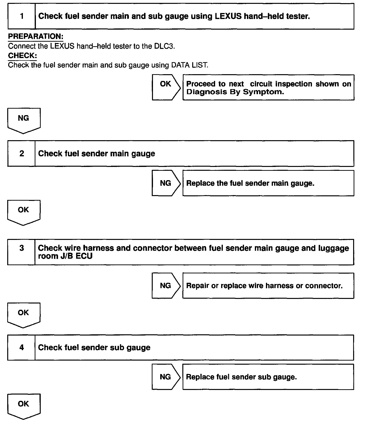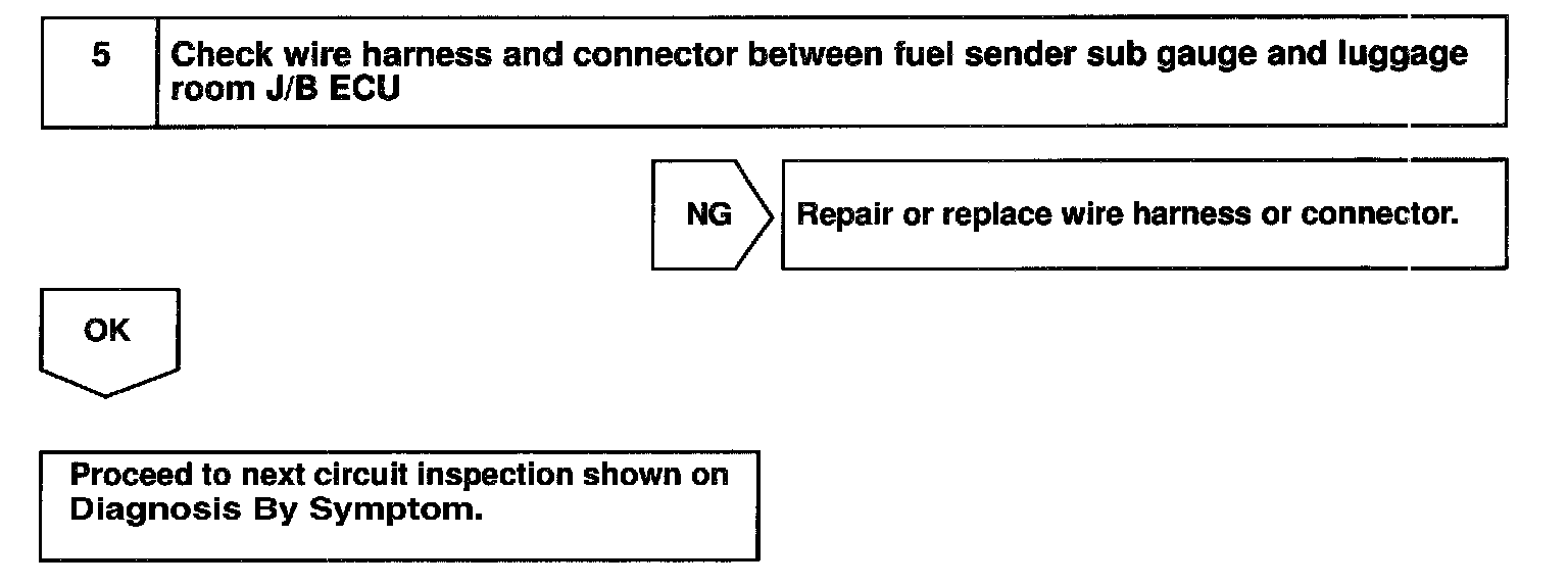 The luggage room J/B ECU detects the condition of the fuel sub sender gauge and sends it to the combination meter via multiplex communication circuit.