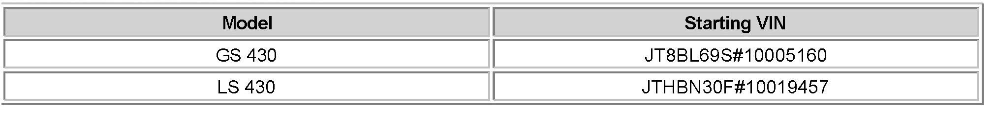 APPLICABLE VEHICLES: 2001 model year GS430 and LS430 vehicles.