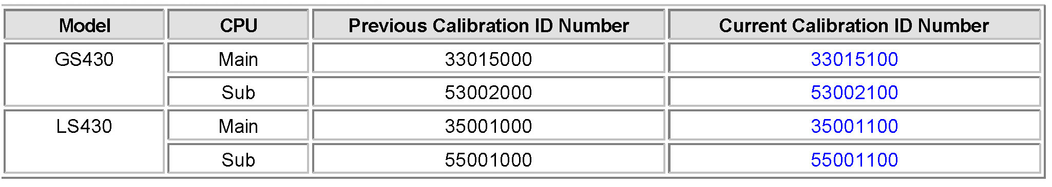 After starting the engine under certain cold operation conditions, some 2001 model year GS 430 and LS 430 vehicles may exhibit M.I.L. "ON" with numbers P0300 through P0308 (random misfire and single cylinder misfire). The Engine Control Module (ECM) calibration files were revised to correct this condition.