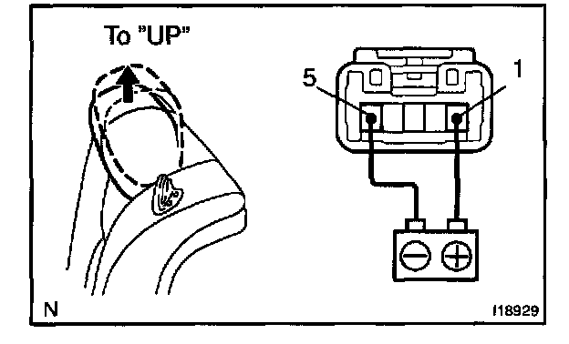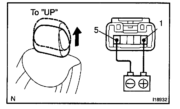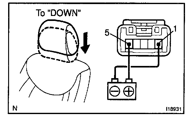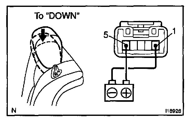 a. Connect the positive (+) lead from the battery to terminal 1 and the negative (-) lead to terminal 5 on the motor connector and move the headrest to DOWN position.