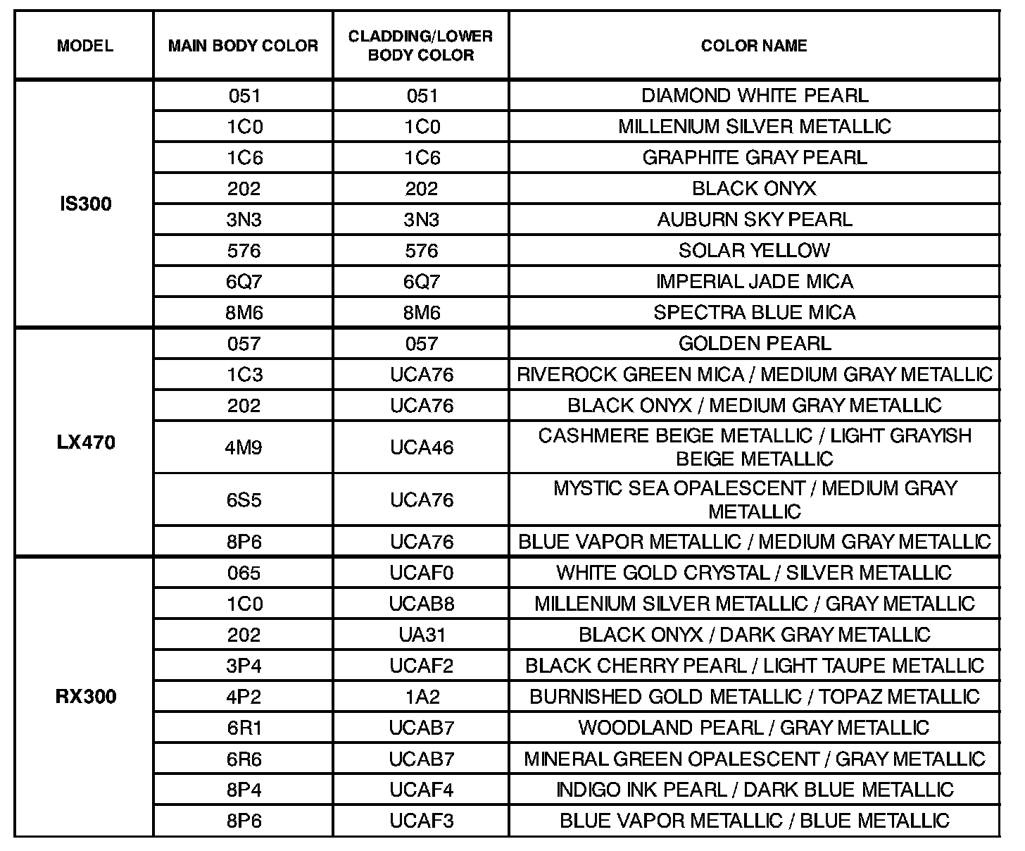 The following information outlines single and two-tone paint schemes used on 2001 model year Lexus vehicles.