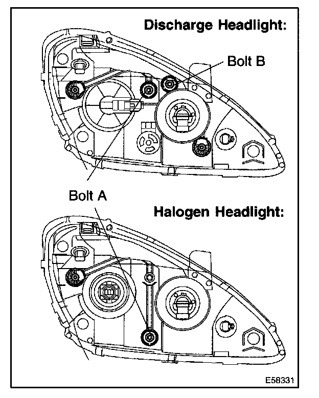 Using adjusting bolt B, adjust the headlight aim to be within the specified range. (Discharge Headlight) Using adjusting bolt A, adjust the headlight aim to be within the specified range. (Halogen Headlight)