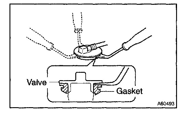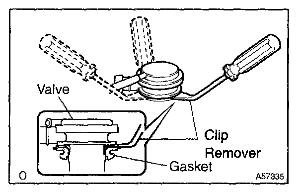 b. Insert a clip remover between the check valve and the gasket, remove the valve by gradually pushing it upward.