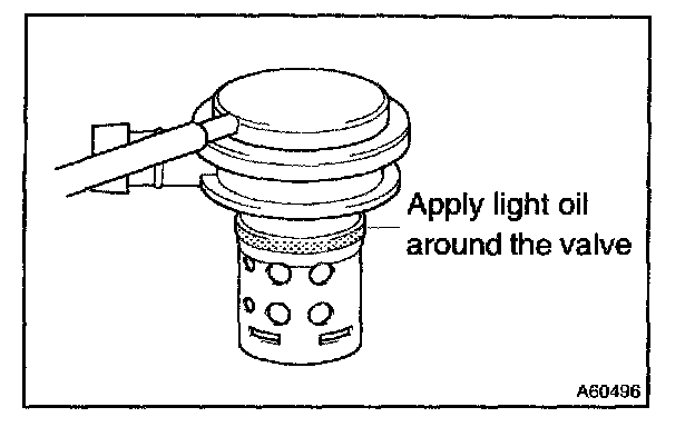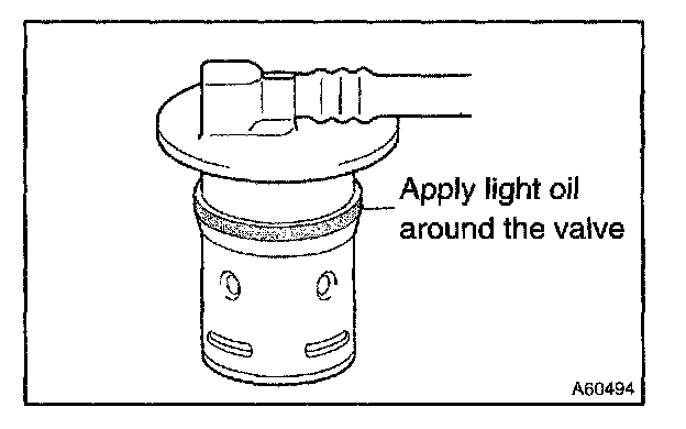 b. Apply light oil around the new check valve as shown in the illustration, and insert it into the tank without force. Be careful not to drop the gasket into the tank.