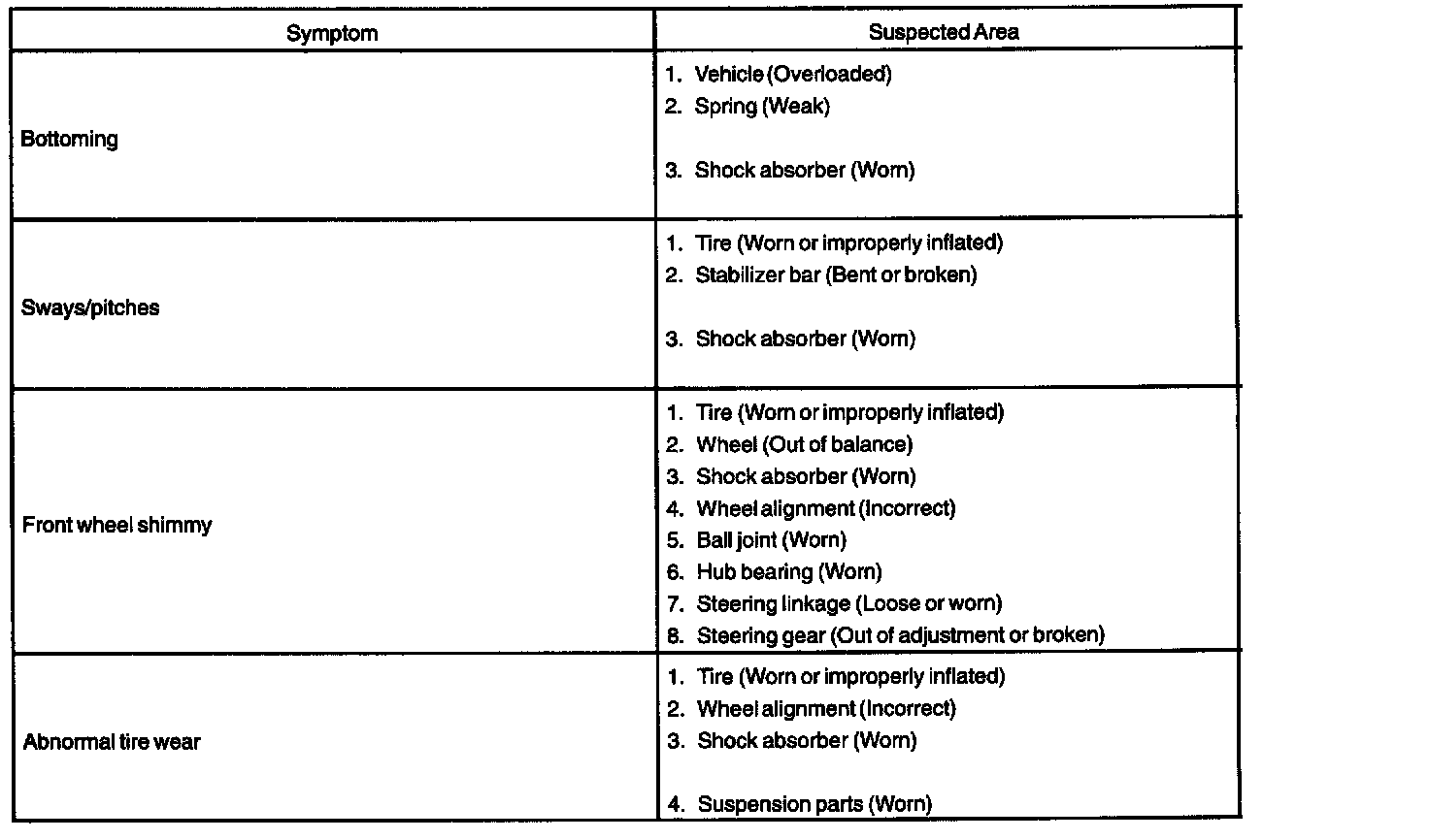 PROBLEM SYMPTOMS TABLE