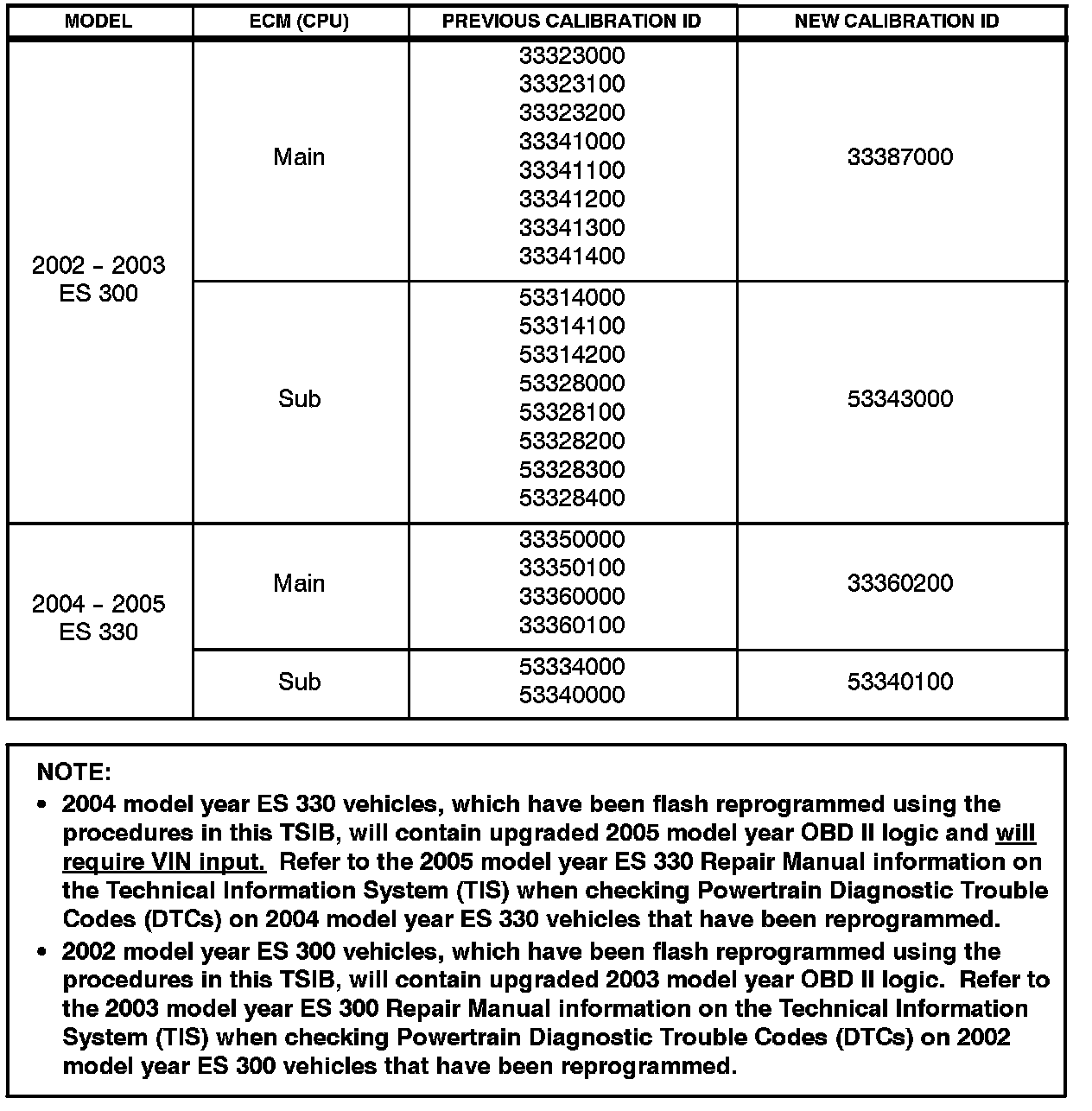 ^ April 1, 2005: 2004 - 2005 model year ES 330 vehicles have been added to Applicable Vehicles. Introduction and Note have been updated.