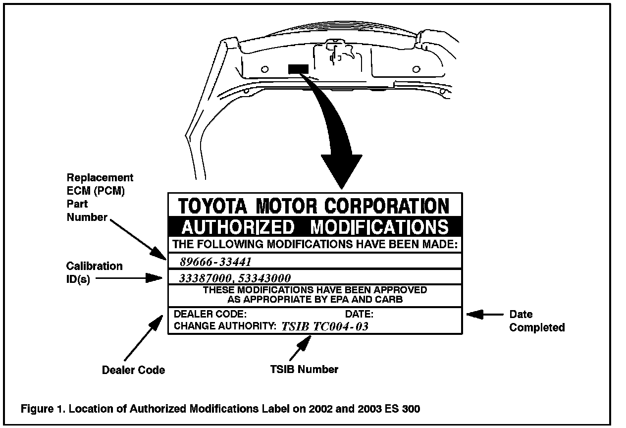 1. Check for the Authorized Modifications Label affixed to the vehicle in the location Procedure shown in Figure 1. Confirm if ECM (PCM) calibration has been updated. If not the latest ECM (PCM) calibration go to step 2.