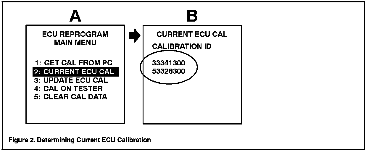 2. Connect the Diagnostic Tester to the vehicle and select CURRENT ECU CAL from the ECU REPROGRAM MAIN MENU. Determine the vehicle's current ECU calibration (see Figure 2).