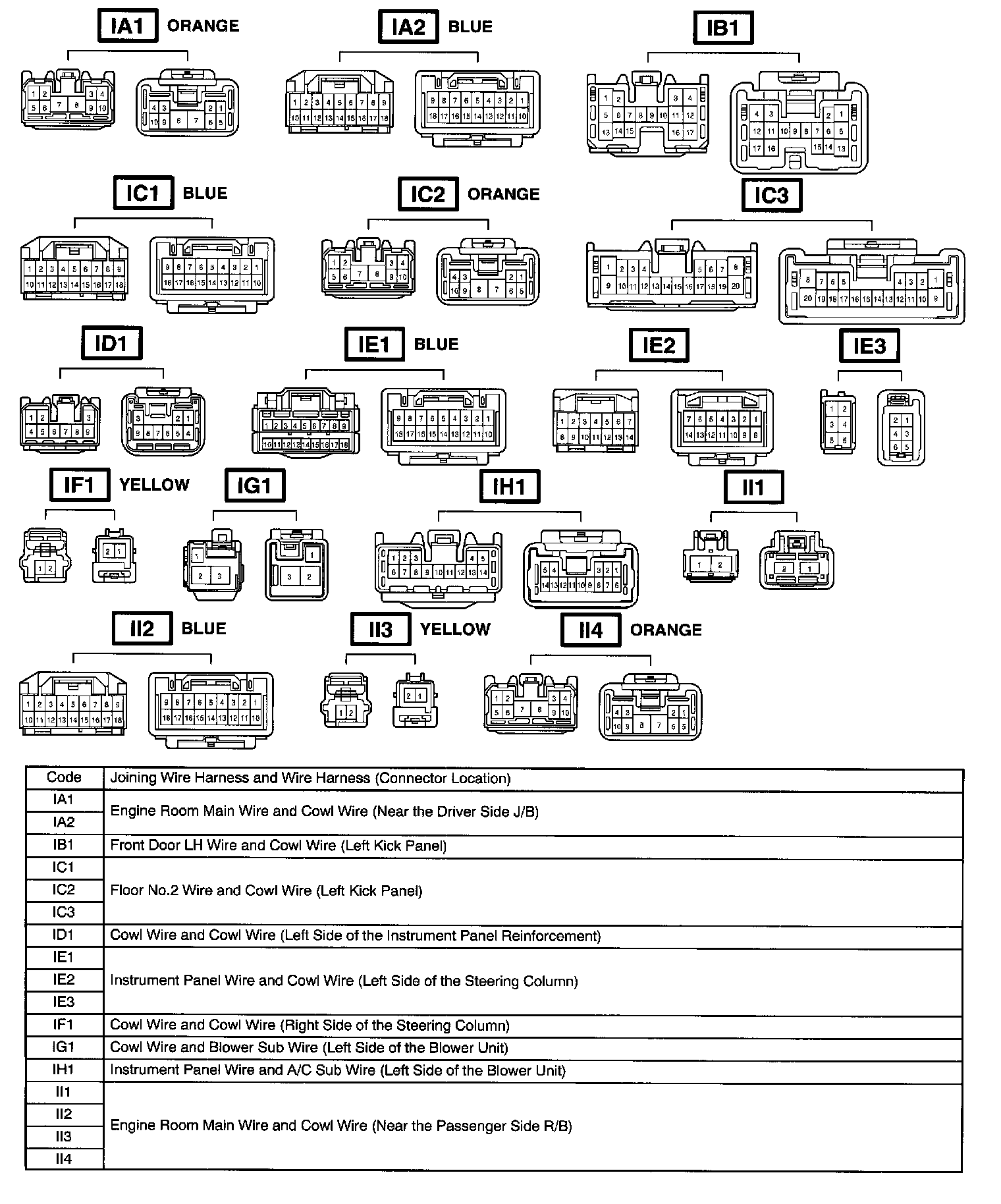 Instrument Panel / Wire Harness To Wire Harness Connectors (IA1 - IA3, IB1, IC1 - IC2, ID1, IE1 - IE3, IF1, IG1, IH1, II1 - II4):