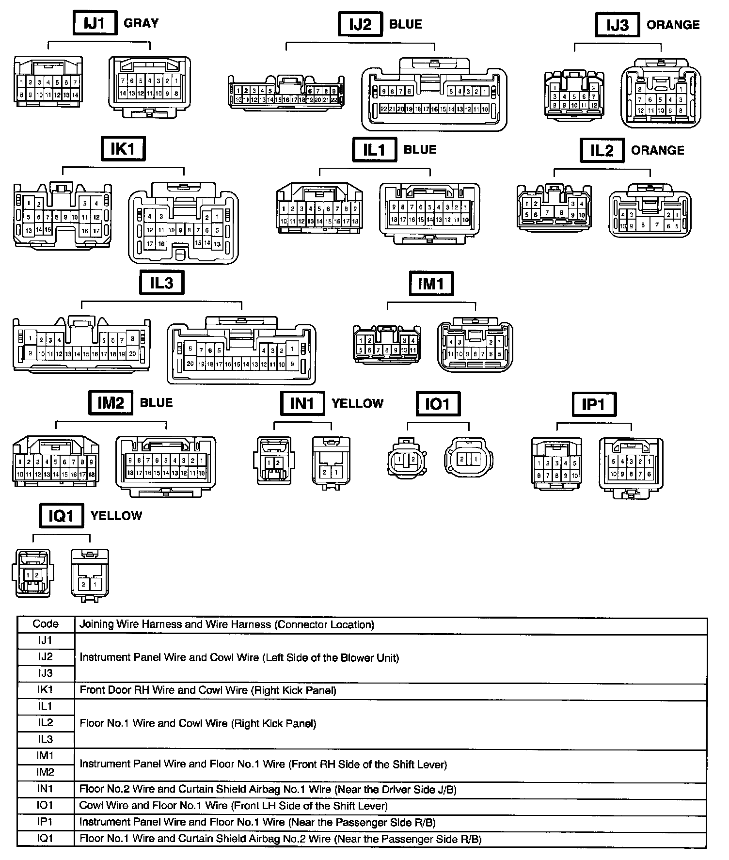 Instrument Panel / Wire Harness To Wire Harness Connectors (IJ1 - IJ3, IK1, IL1 - IL3, IM1, IM2, IN1, IO1, IP1, IQ1):