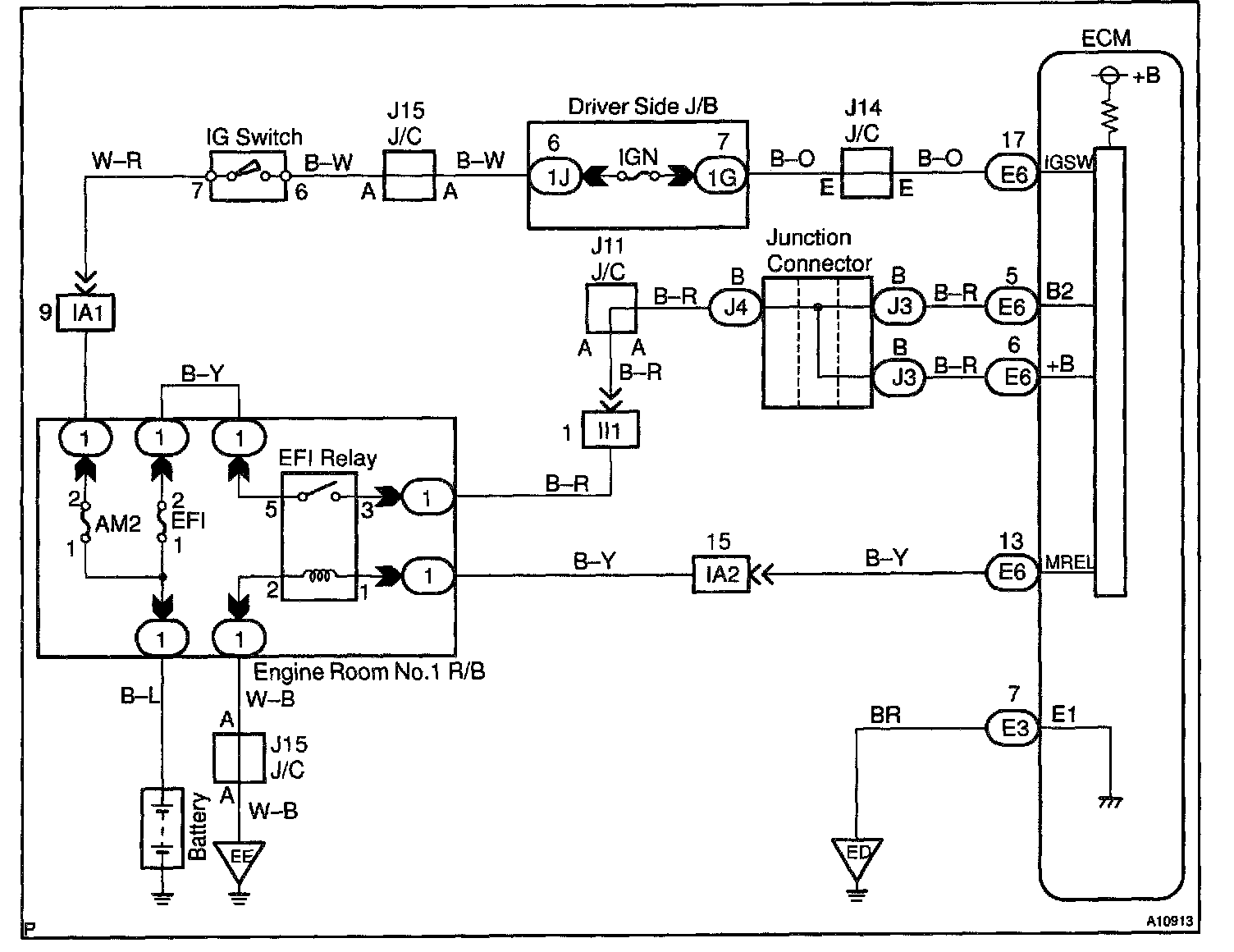 This signal causes current to flow to the coil, closing the contacts of the EFI main relay and supplying power to terminals +B and B2 of the ECM.