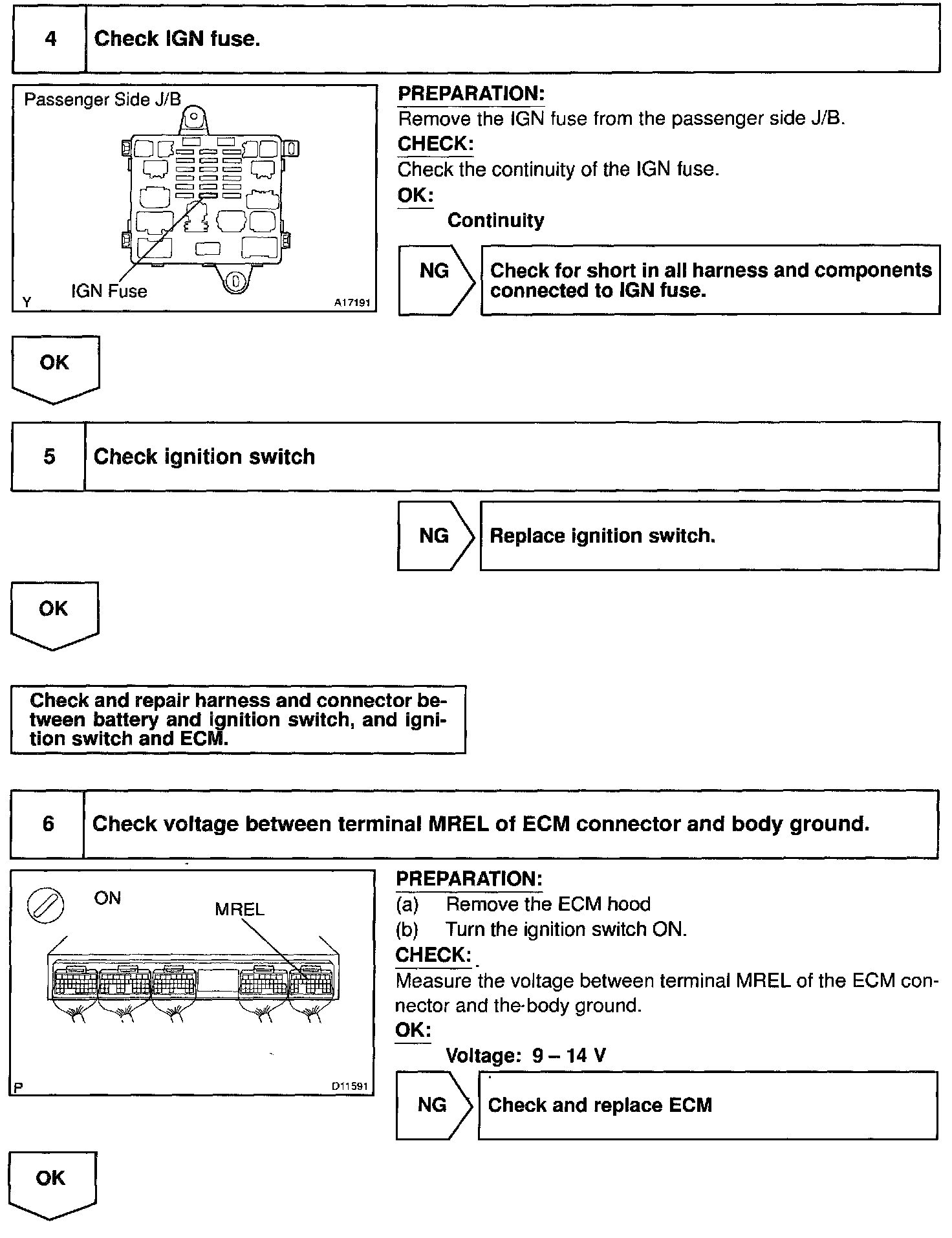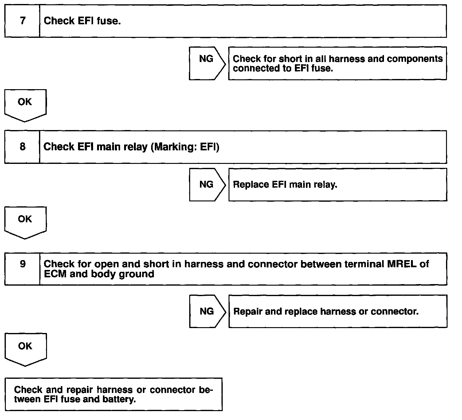 When the ignition switch is turned ON, battery positive voltage is applied to terminal IGSW of the ECM and the EFI main relay (Marking: EFI) control circuit in the ECM sends a signal to terminal MREL of the ECM, switching on the EFI main relay.