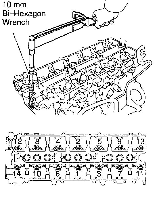 c. Using a 10 mm bi-hexagon wrench, uniformly tighten the cylinder head bolts, in several passes, in the sequence shown.