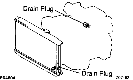 b. Loosen the 2 drain plugs (for the engine and radiator), and drain the coolant.