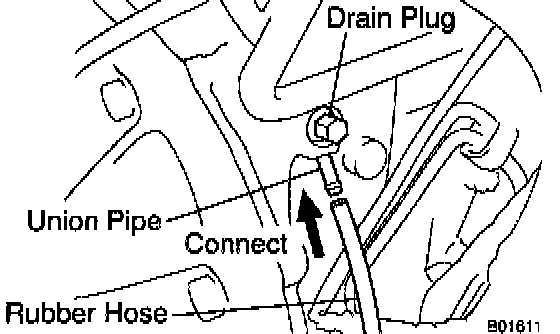 HINT: To prevent the coolant from spraying over the cylinder block, connect the rubber hose (inside diameter 6 - 8 mm (0.24 - 0.31 inch)) in the market to the union pipe under the drain plug.