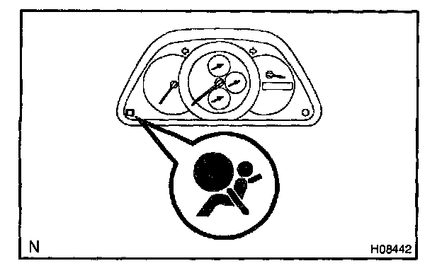 The SRS warning light is located on the combination meter. It goes on to alert the driver of trouble in the system when a malfunction is detected in the airbag sensor assembly self-diagnosis. In normal operation conditions when the ignition switch is turned to the ON position, the light goes on for about 6 seconds and then goes off.