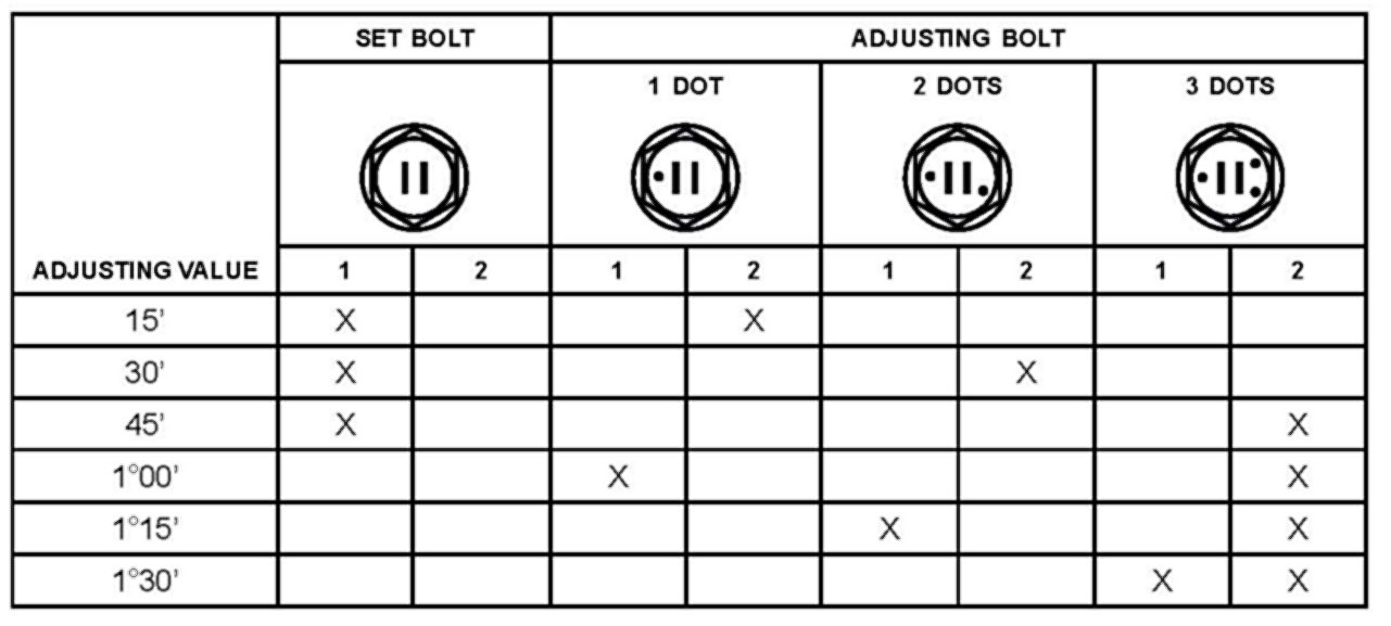 Adjusting value for the set bolts is 6'-30' (0.1° 0.5°). When making an adjustment of more than 45', replace the upper and lower steering knuckle set bolts with the adjusting bolts. If the camber is NOT within the specification, use the table shown to estimate how much additional camber adjustment will be required, and select the appropriate camber adjusting bolt.