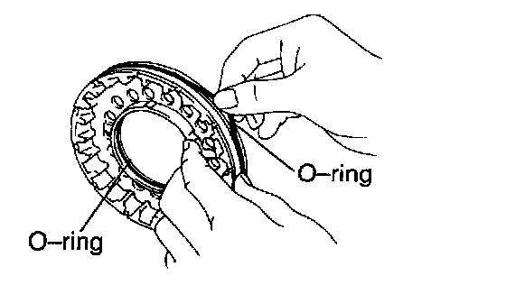 b. Being careful not to damage the O-rings, press the direct clutch piston into the clutch drum with both hands.