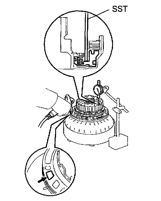 b. Using SST and a dial indicator, measure the O/D direct clutch piston stroke while applying and releasing compressed air (392 kPa, 4 kgf/cm2, 57 psi).
