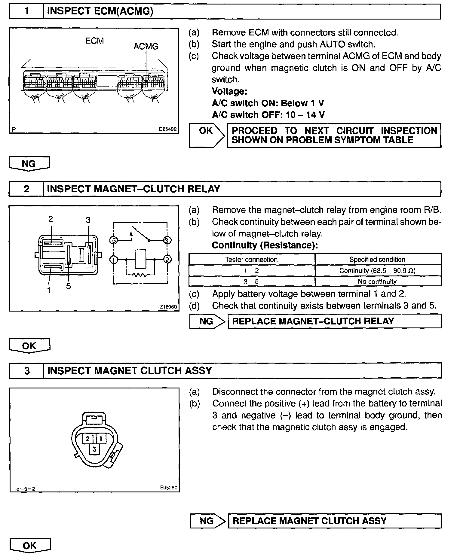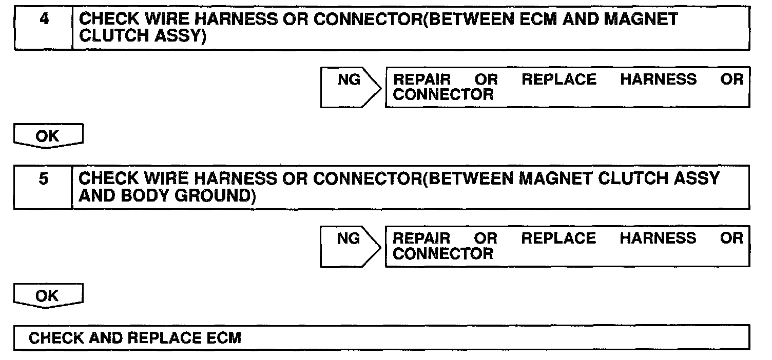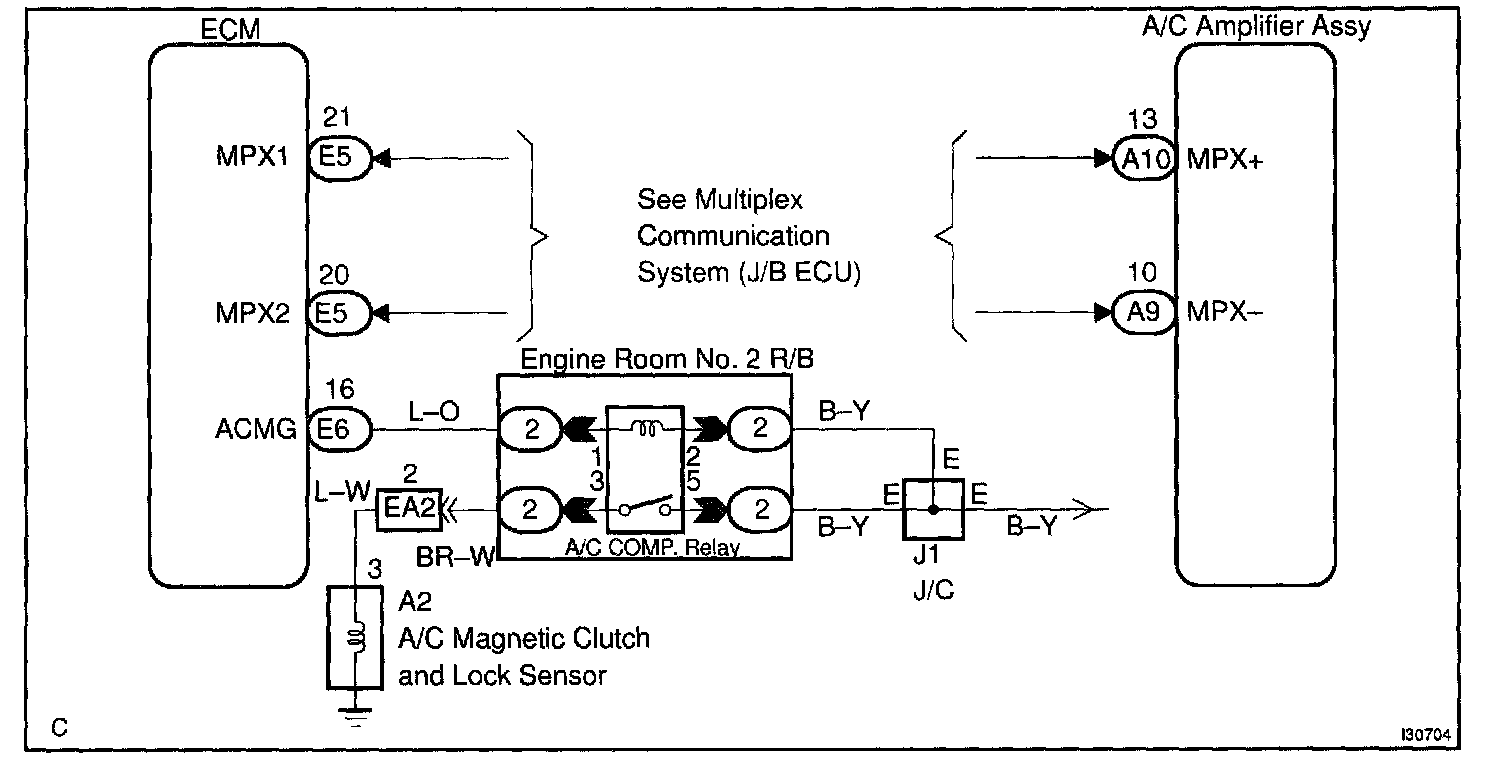 CIRCUIT DESCRIPTIONThe air conditioning amplifier outputs the magnetic clutch ON signal from terminal MPX to the ECM receives this signal, it sends a signal from terminal ACMG and switches the magnetic clutch relay ON, thus turning on the magnetic clutch.