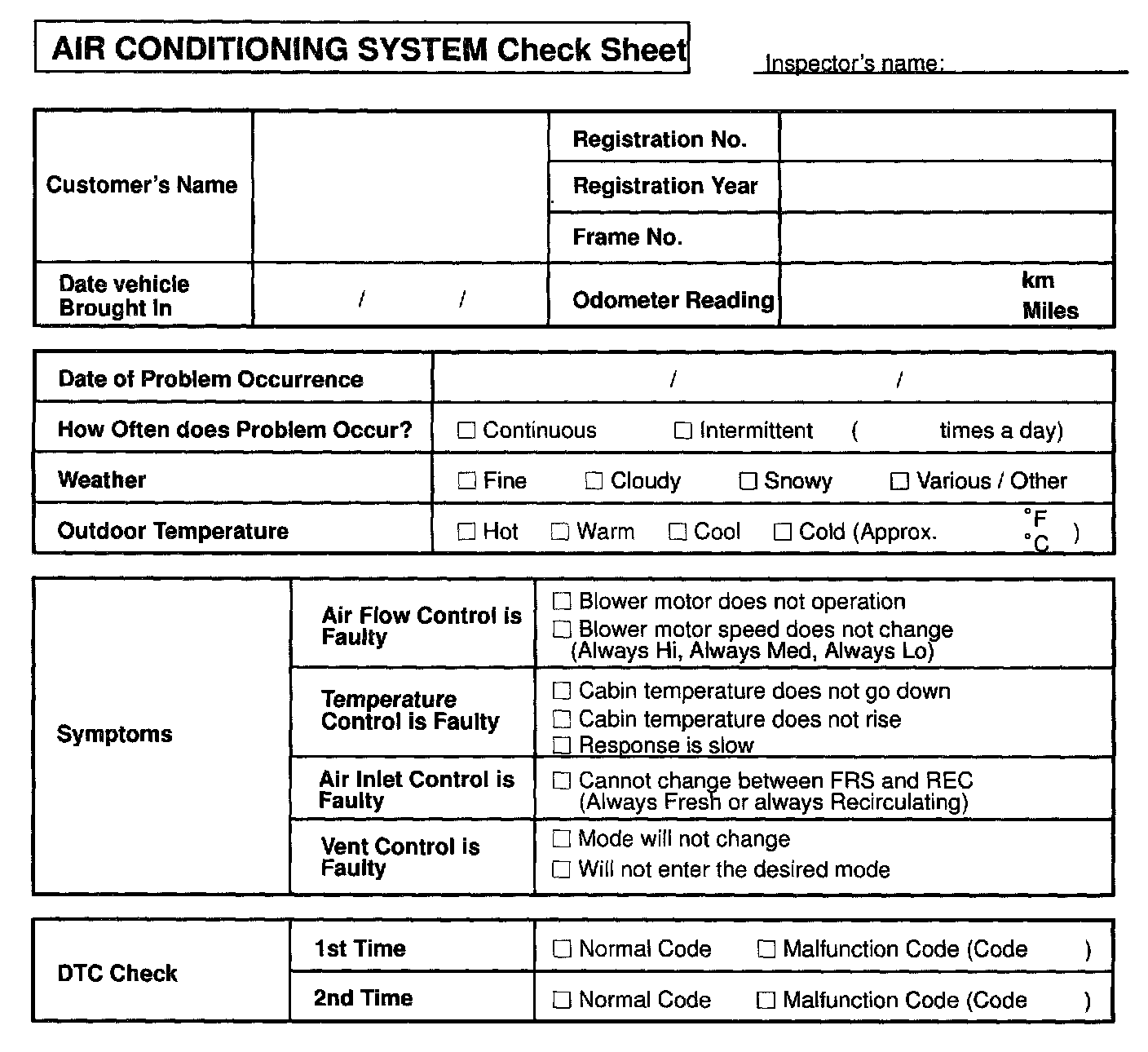 Air Conditioning System Check Sheet: