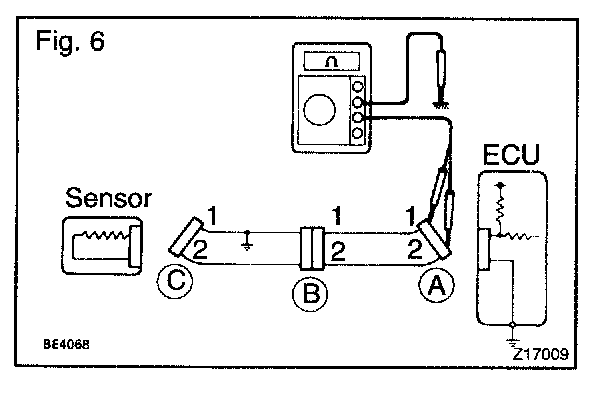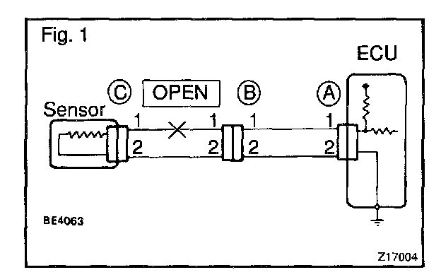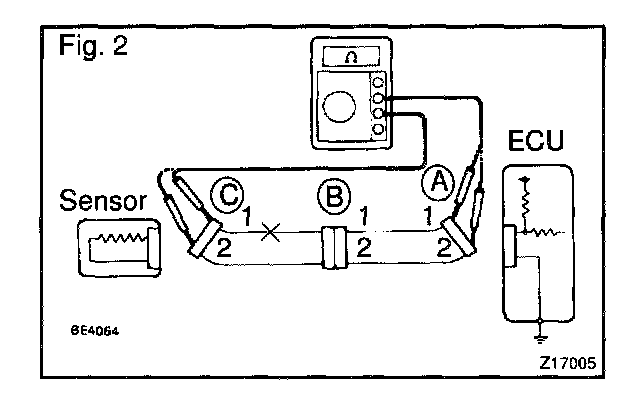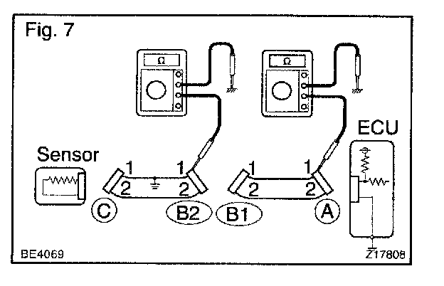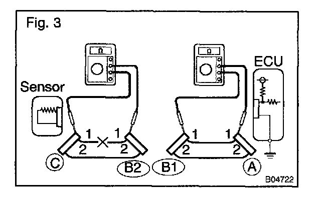In the case of Fig. 3: Between terminal 1 of connector "A" and terminal 1 of connector "B1" Continuity Between terminal 1 of connector "B2" and terminal 1 of connector "C" No continuity (open)