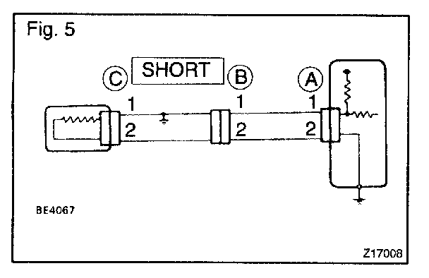 a. If the wire harness is ground shorted as in Fig. 5, locate the section by conducting a "continuity check with ground".
