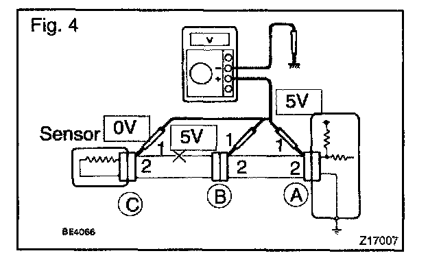 As shown in Fig. 4, with each connector still connected, measure the voltage between the body ground and terminal 1 of connector "A" at the ECU 5 V output terminal, terminal 1 of connector "B", and terminal 1 of connector "C", in that order.